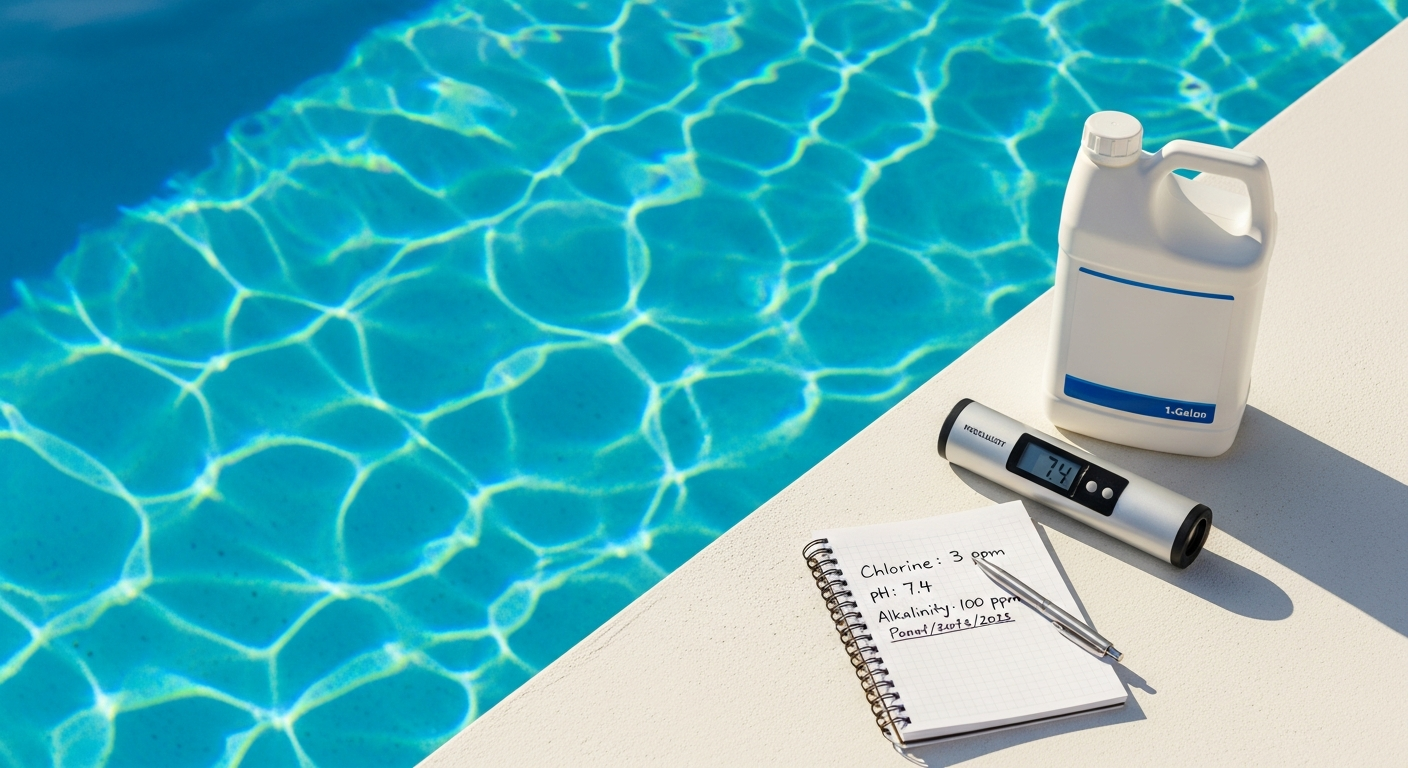 To raise free chlorine (FC) by 1 ppm in 10,000 gallons, add roughly 11 fl oz (0.85 cups) of 12.5% liquid chlorine — or 22 fl oz of household 6% bleach. Pour into the deep end with the pump running, in the evening, and retest after an hour of circulation.
